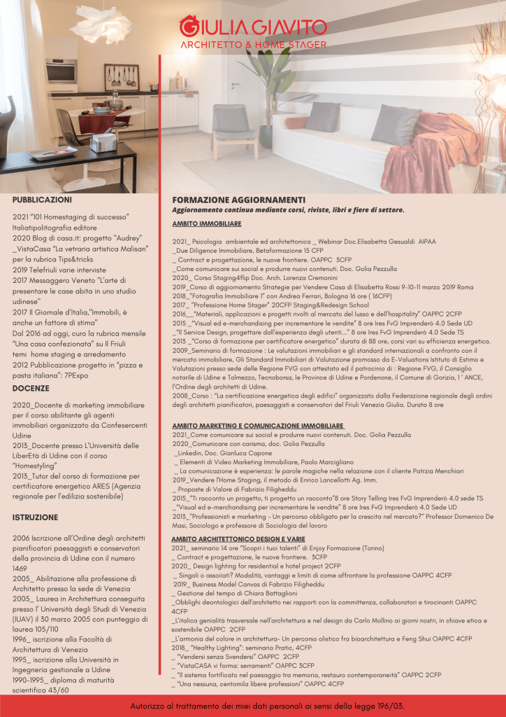 Ho disegnato la mia carriera in modo del tutto personale e sono giunta alle attuali competenze come un coronamento di un percorso formativo a tutto tondo sull’immobiliare: partendo dalle perizie di parte e bancarie, la progettazione per il privato, per arrivare alla valorizzazione per la vendita. Un processo che tutt’oggi si alimenta reciprocamente, le competenze ed i punti di vista dell’uno aiutano l’altro a trovare la chiave corretta per ottenere il miglior risultato. Le competenze di progettazione e di interni per il privato hanno formato quell’esperienza che viene sfruttata per la vendita di un immobile, tuttavia sono necessarie ulteriori competenze di comunicazione, marketing, psicologia…Per ottenere il risultato. Purtroppo il lavoro di home Staging professionale viene confuso a causa della carenza di informazione e per comodità di professionisti, privi di una specifica preparazione, che adoperano la parola semplicemente per attirare l’attenzione o, peggio, per accaparrarsi un lavoro in più di cui non sono competenti.